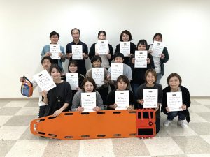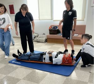 心肺蘇生法やAEDの使い方、また、脳震盪、心停止、熱中症、アナフィラキシーについての講義など、スポーツの現場での緊急対応、安全な搬送方法など楽しく学ぶことができました。最後に筆記試験があり全員無事合格!スポーツ救命ライセンスを頂きました。今後も地域の皆さまに安心・安全な医療、またスポーツ環境が提供できるようスッタフ一同努めて参ります。