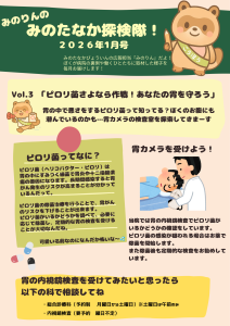 みのりんのみのたなか探検隊1月号をお届けします。 今月は胃の内視鏡検査、ピロリ菌についてご紹介しています。 当院では口からの検査はもちろん、鼻から検査をすることができます。 ぜひご覧ください!
